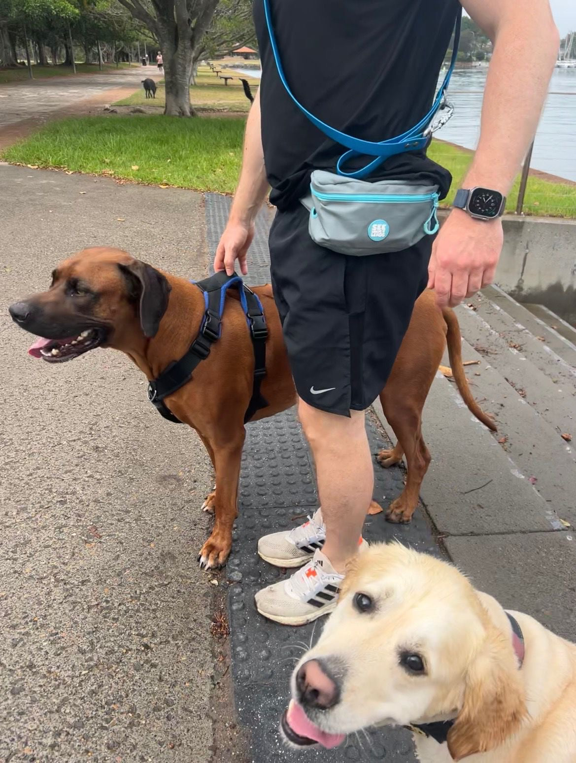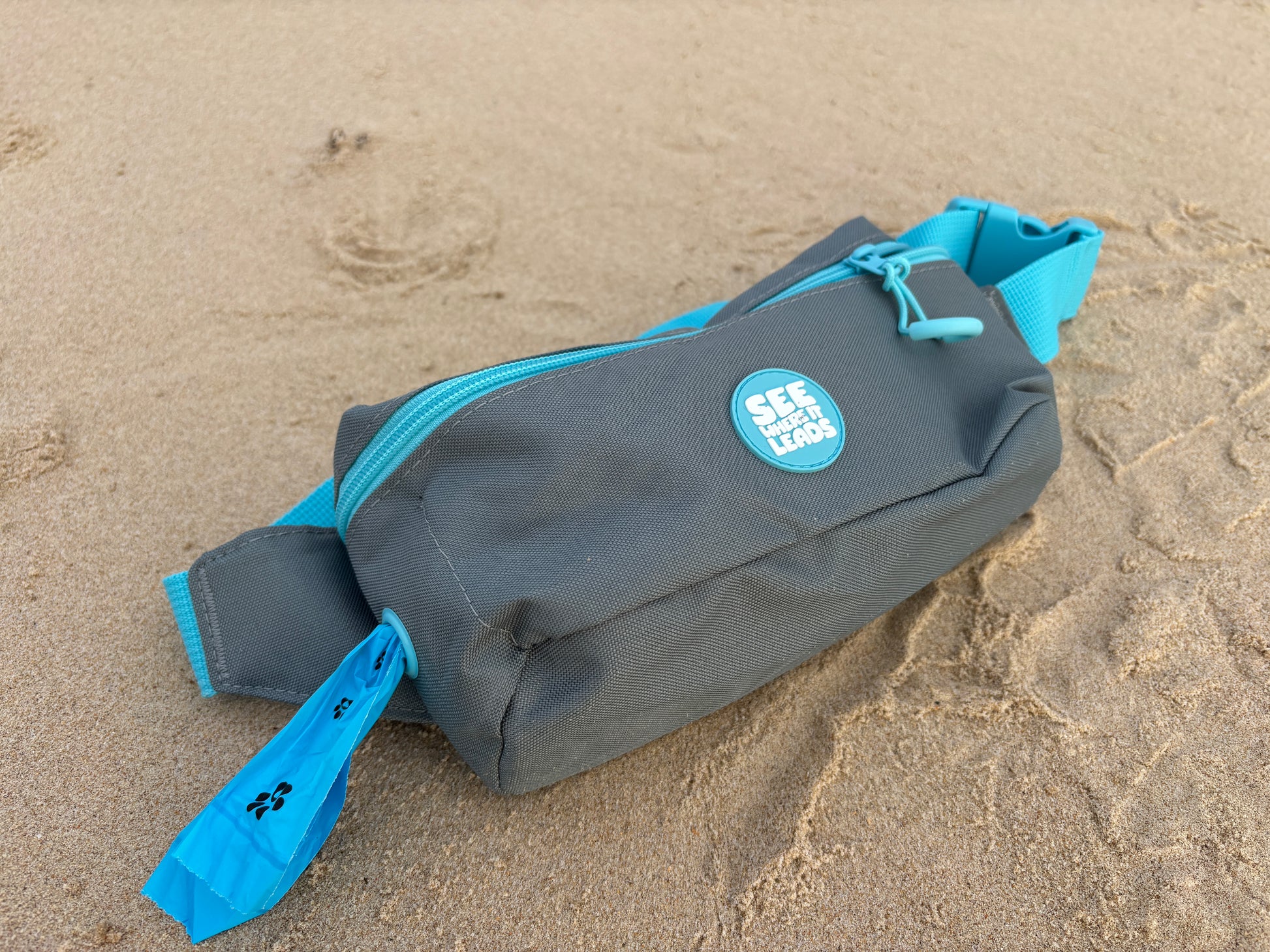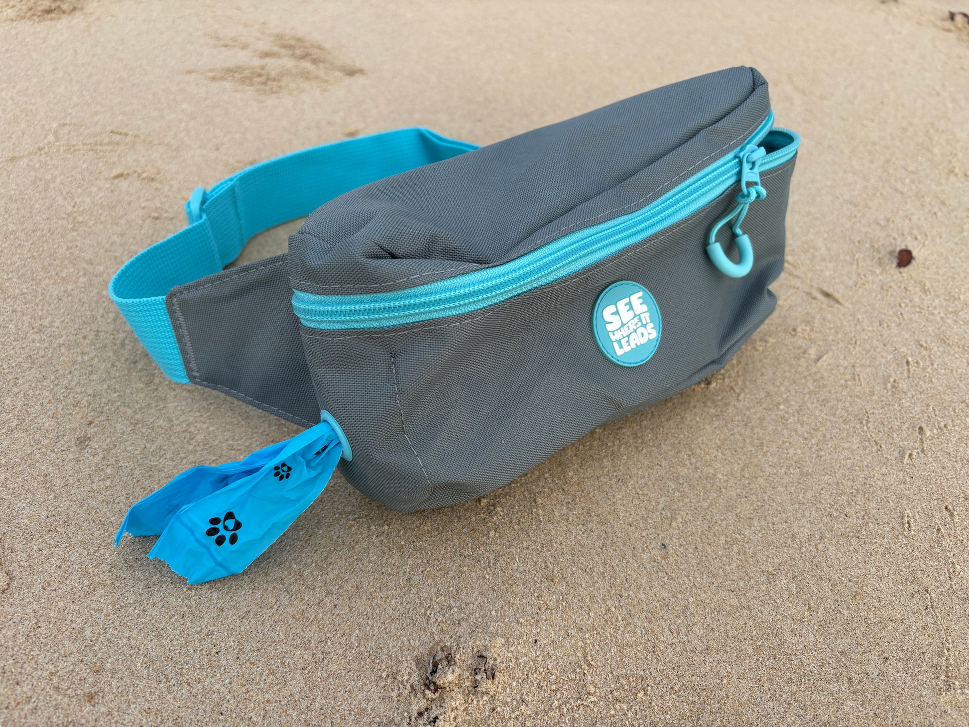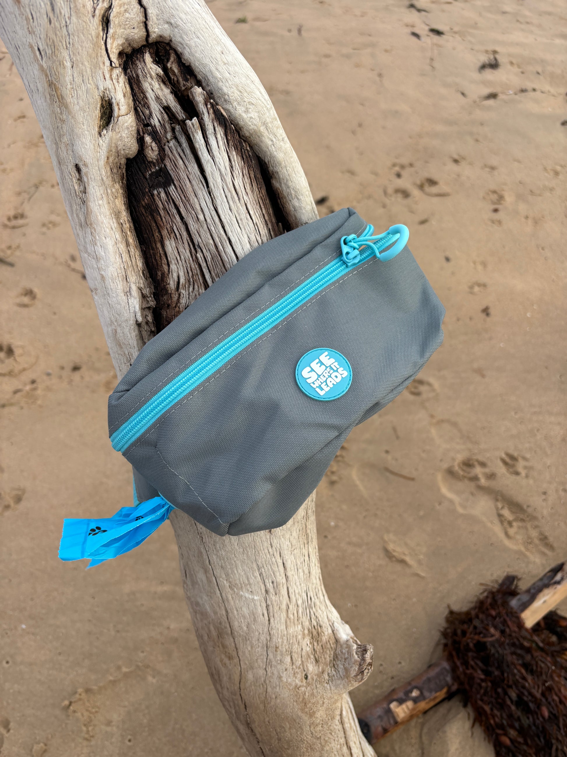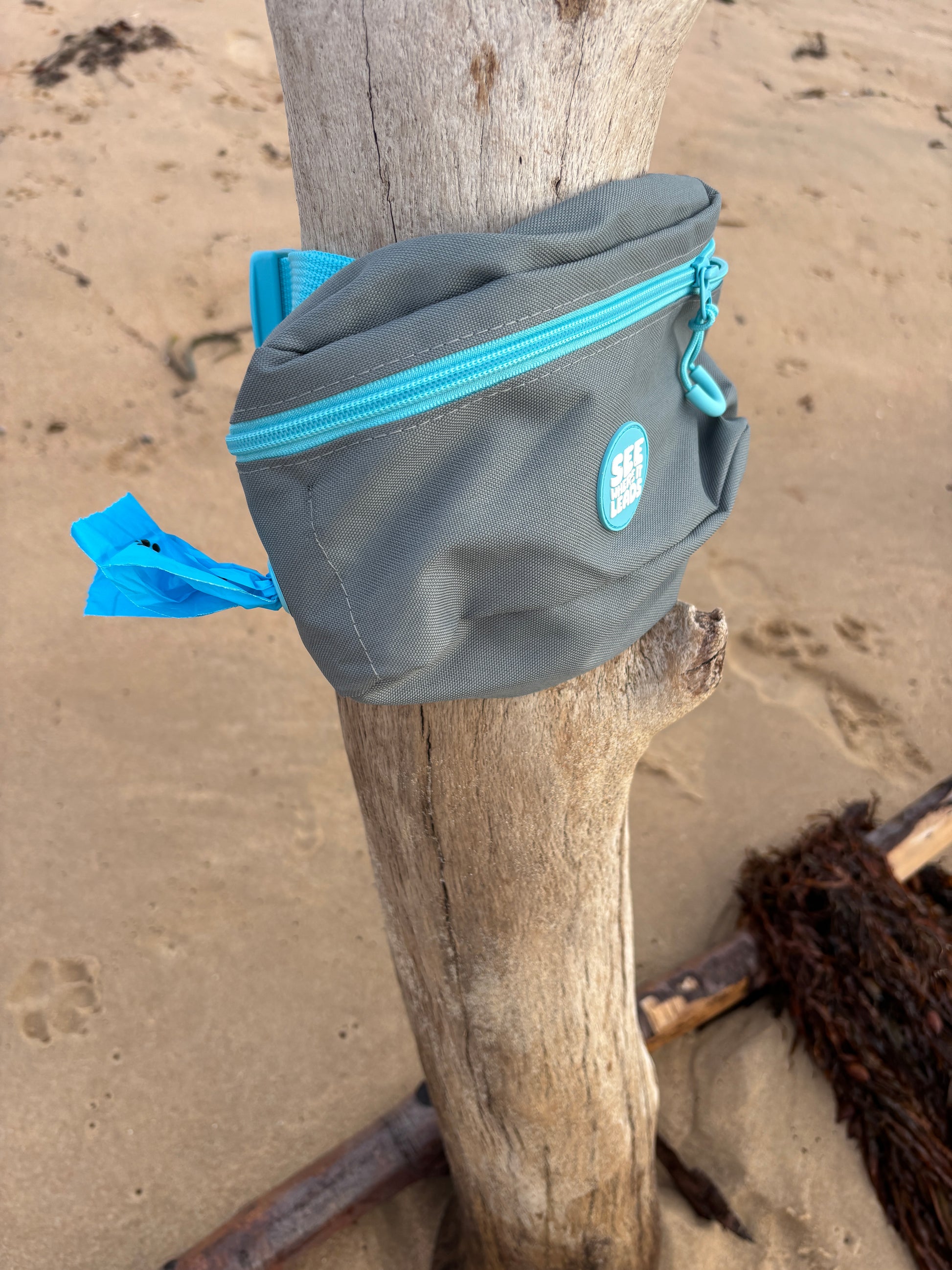 A bum bag built for Australian dog owners. Durable, machine washable, made from recycled materials. Features poo bag dispenser, phone pocket, and room for treats and essentials. Perfect for beach walks, park visits, and hiking with your dog. Blue accents visible to dogs. $5 per bag supports dog rescue.